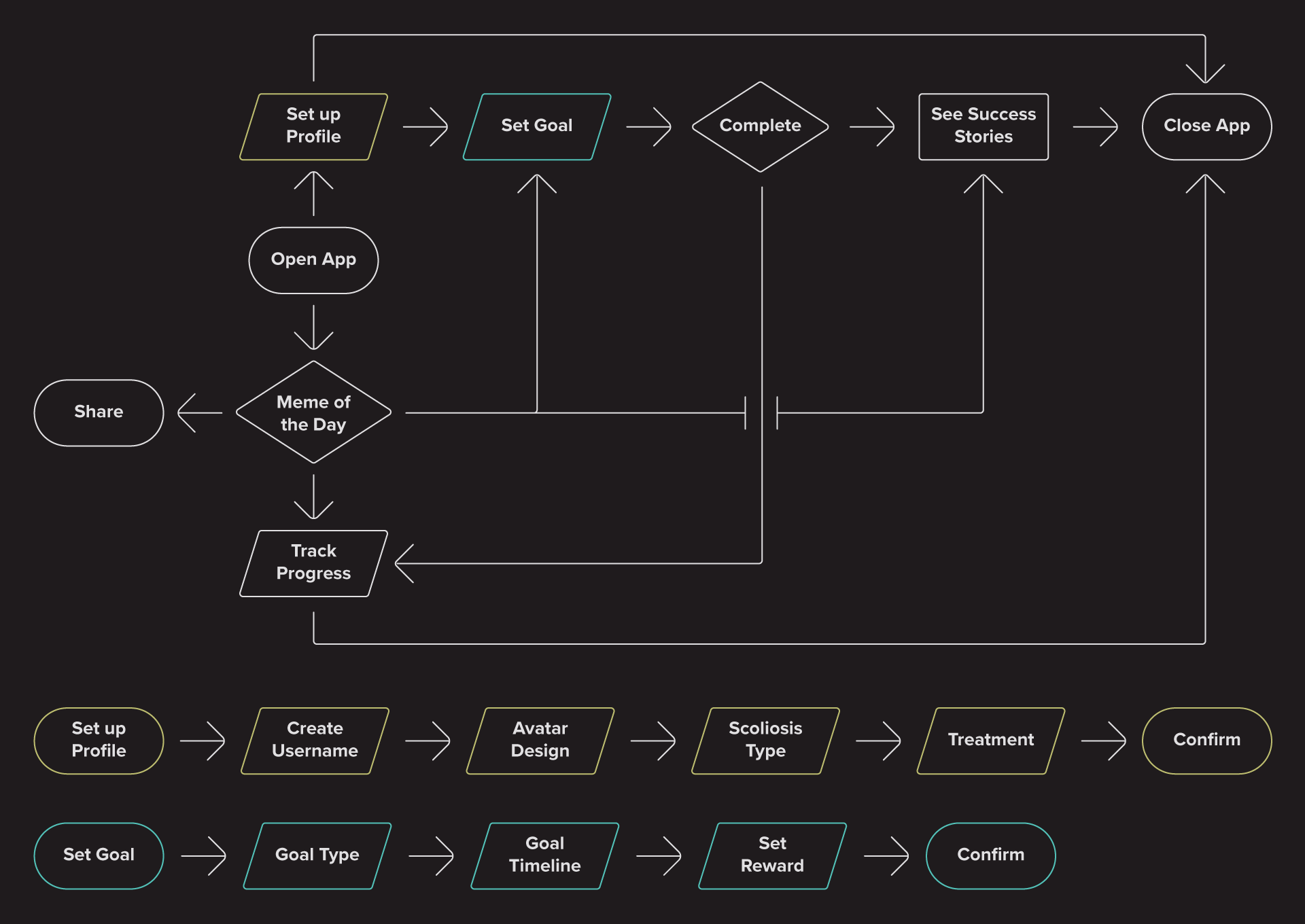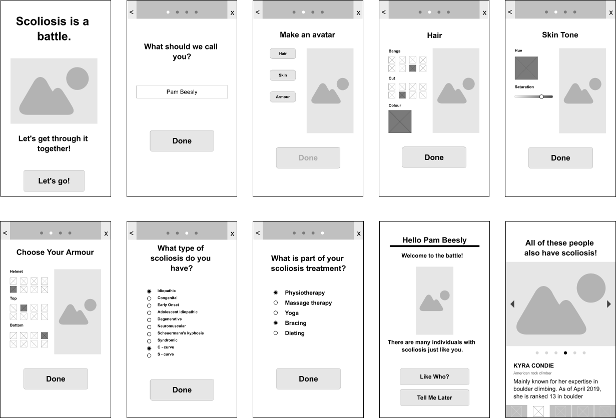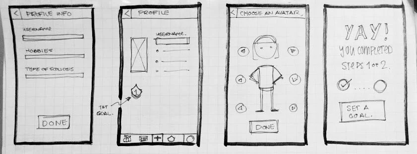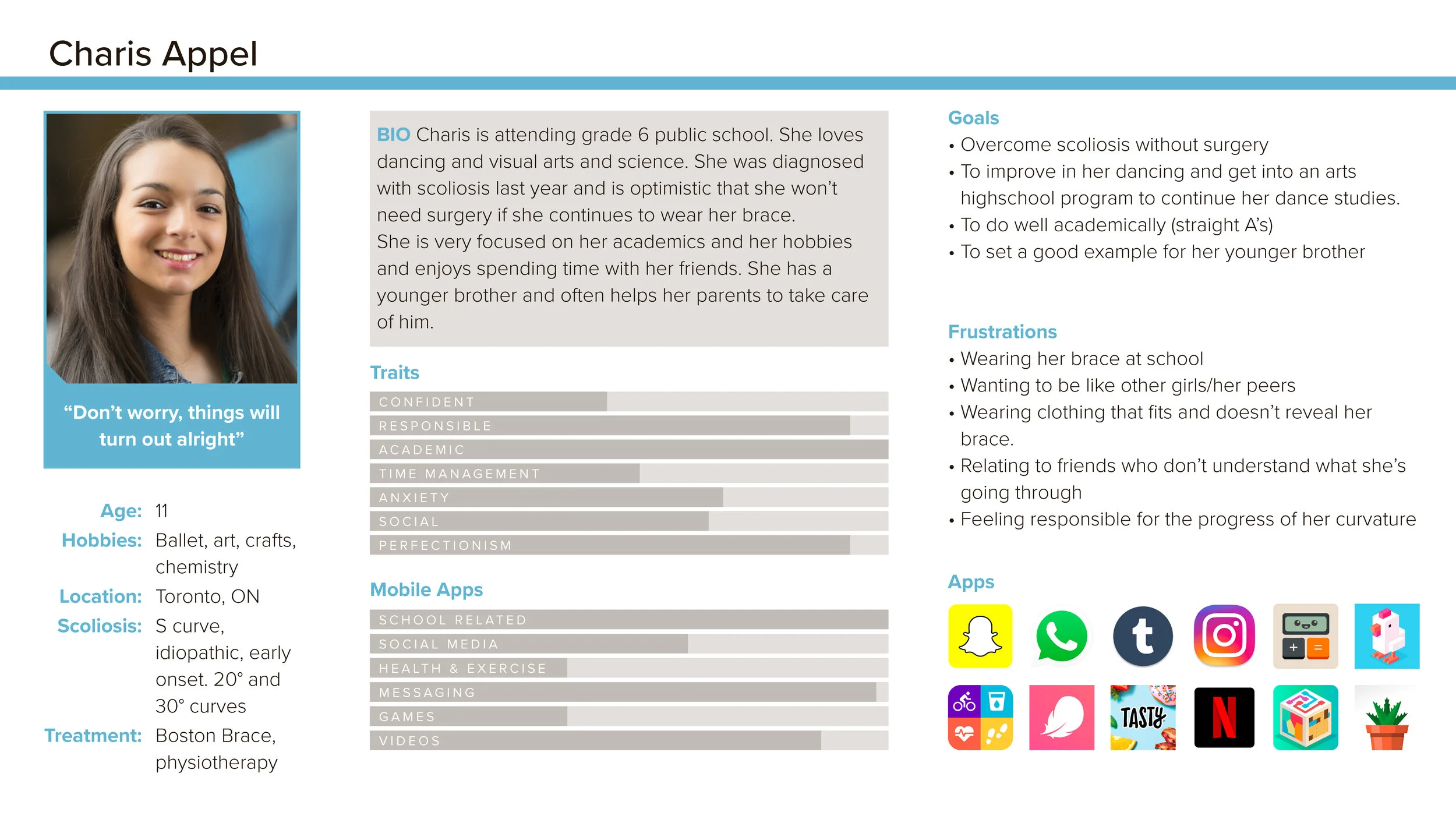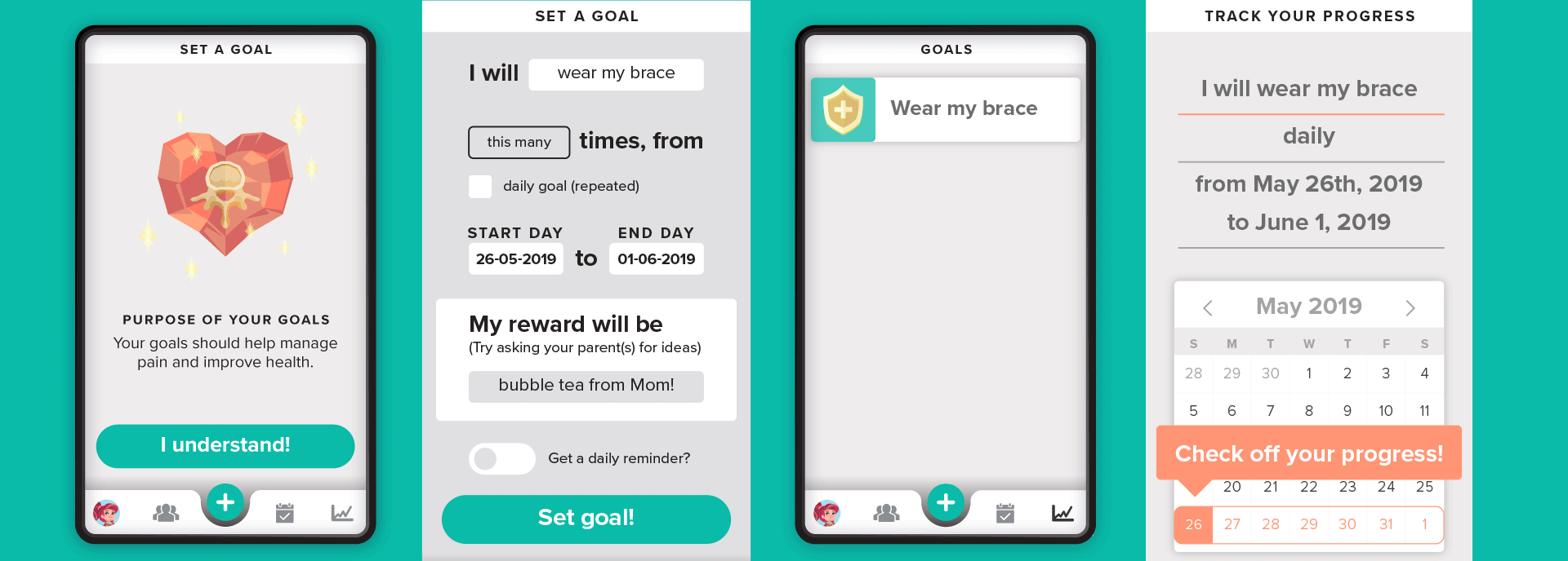 Patients connect to the app through a personalized character profile. They set goals and earn badges based on completion of their treatment such that their validation and worth is connected to adhering to their treatment plan instead of the progression of their curvature.