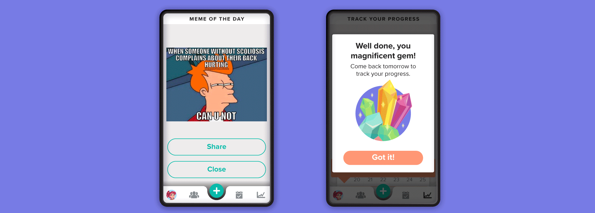 Our research indicated that humour and visuals shape youth engagement. In a culture driven by memes, fun graphics was a big user ask. On opening the app, users are greeted with a scoliosis meme of the day, pulled from social media. Additionally, all tasks are acknowledged by a nonsensical, but fun compliment.